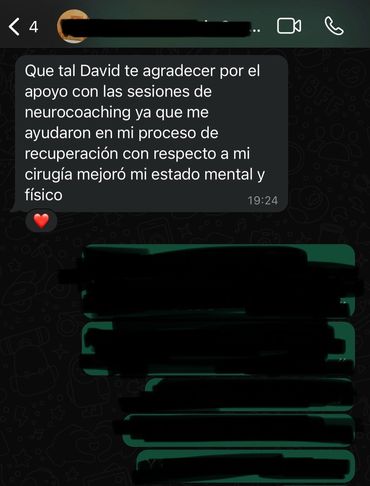 "David: La verdad EN TAN POCAS SESIONES HE SENTIDO MUCHO CAMBIO, me gusta la forma en que llevas la sesión, das una confianza enorme y la verdad te estoy muy agradecida por lo que hasta hoy he logrado... Gracias!"